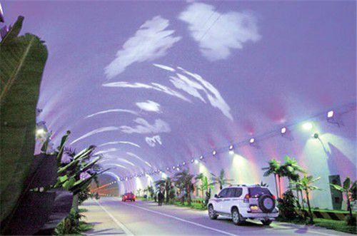 The Zhongnanshan (Zhongnan Mountain) tunnel, which passes through the Qinling mountains in northwest China's Shaanxi province, was opened on Jan. 20, 2007. The tunnel is equipped with lights in different colors and patterns. Each tunnel is decorated with artificial plants as well as images of clouds projected over the ceiling at certain sections in order to reduce the eye strain of drivers.