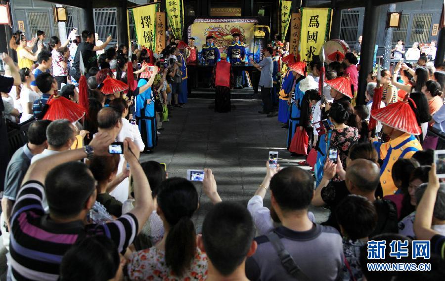 Tourists participate in an interactive activity in Langzhong ancient town, southwest China's Sichuan province, May 19, 2015. Tuesday is China's fifth National Tourism Day. Many scenic spots have taken certain measures and offered discounts to attract more tourists. (Xinhua/Wang Yugui) |