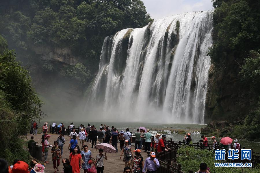 Tourists enjoy the view of the Huangguoshu Waterfall in Anshun, southwest China's Guizhou province, May 19, 2015. Tuesday is China's fifth National Tourism Day. Many scenic spots have taken certain measures and offered discounts to attract more tourists. (Xinhua/Lu Wei) |