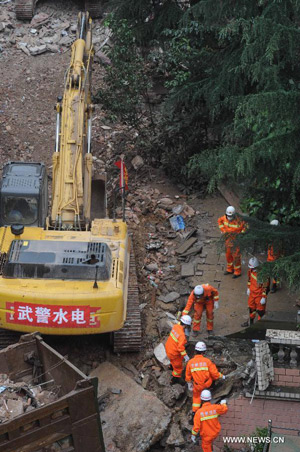 Rescuers search for survivors at a building collapse site in Guiyang, capital of southwest China's Guizhou Province, May 22, 2015. The death toll from the collapsed apartment building has risen to 10, with another 6 still missing. A nine-storey building collapsed in Guiyang on Wednesday, with 114 residents living in it. (Xinhua/Ou Dongqu) |