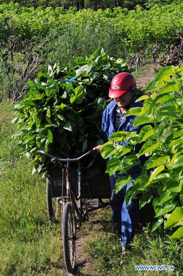 A farmer carries mulberry leaves to feed silkworms at Zhujiadou Village in Huzhou, east China's Zhejiang Province, May 23, 2015. Huzhou is a major cocoon-producing area of China which is expected to harvest about 5,400 tons of spring cocoons this year. (Xinhua/Tan Jin)