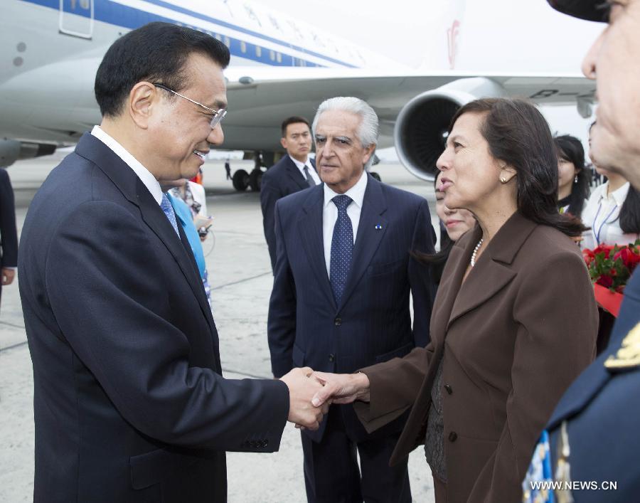 Chinese Premier Li Keqiang (L) arrives in Lima, Peru, on May 22, 2015, for an official visit to Peru at the invitation of Peruvian President Ollanta Humala. Premier Li's wife Cheng Hong arrived with him in the same special flight. (Xinhua/Huang Jingwen) |