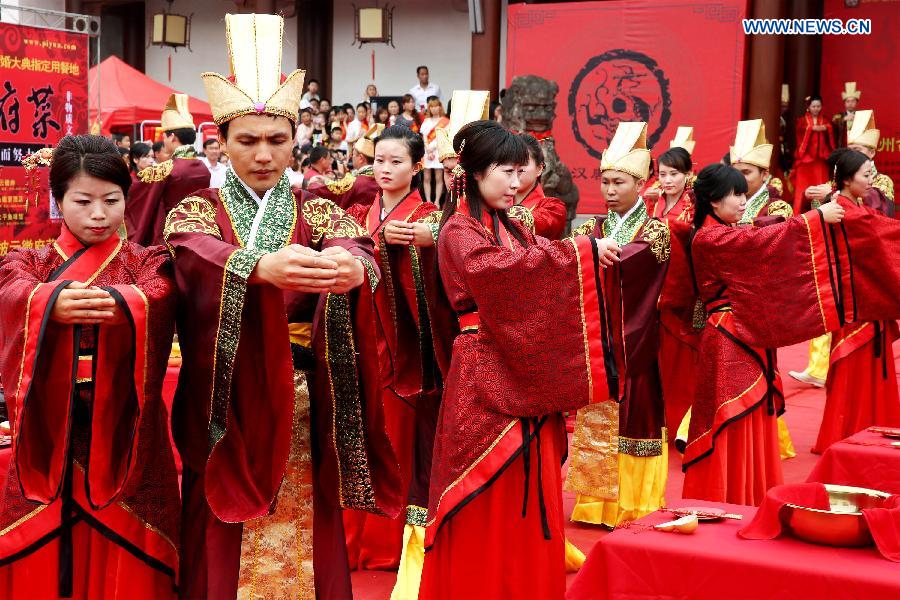 Couples take part in a group wedding ceremony in Shexian County, Huangshan City of east China's Anhui Province, May 24, 2015. A total of 24 couples attended the wedding ceremony which followed the nuptial rites of Han Dynasty (220 B.C.-220 A.D.) on Sunday. (Xinhua/Wu Sunmin)