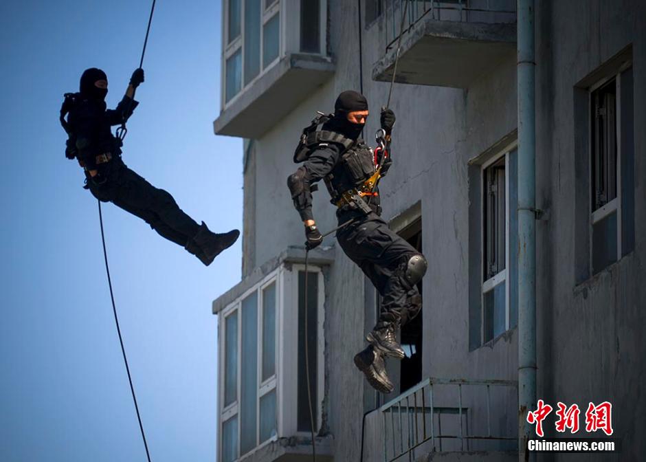 Special police force conducted multi-subject training in Urumqi, northwest China’s Xinjiang Uygur Autonomous Region on May 21, 2015. The training subjects included 110-meter steeplechase, abseiling, physical training, shooting, etc. Established in 2010, the special police force of Xinjiang has played an important role in combating terrorism and maintaining social stability. (Chinanews/Liu Xin)