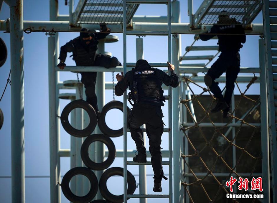 Special police force conducted multi-subject training in Urumqi, northwest China’s Xinjiang Uygur Autonomous Region on May 21, 2015. The training subjects included 110-meter steeplechase, abseiling, physical training, shooting, etc. Established in 2010, the special police force of Xinjiang has played an important role in combating terrorism and maintaining social stability. (Chinanews/Liu Xin)