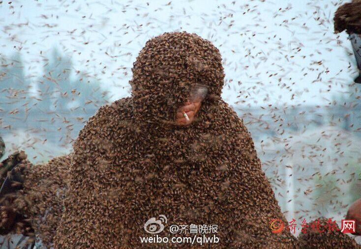 Gao Bingguo is covered with bees during an attempt to break the Guinness World Record for being covered by the largest number of bees in Taian city, East China’s Shandong province, May 25, 2015. Despite bee stings, Gao set a new record for having 109.05 kg of bees on his body at one time. (Photo/Weibo of Qilu Evening News)