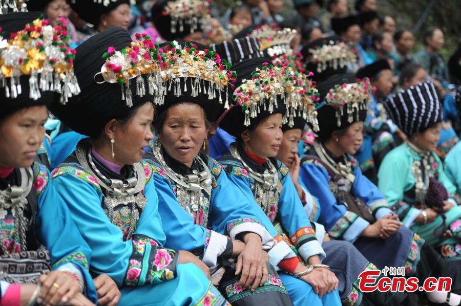 Performers of the Miao ethnic group dance during a folk festival in Shanjiang town, Fenghuang (Phoenix) county, Central China’s Hunan province, May 25, 2015. The festival, celebrated on April 8 in the Chinese lunar calendar or May 25 this year, has been included in the third batch of state-level intangible cultural heritage. (Photo: China News Service/Yang Huafeng)