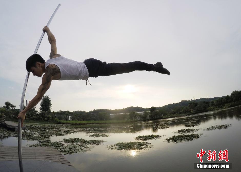 Wu Xin, who represented China to attend the pole dancing world championship early this year, is an outstanding male pole dancer. Male pole dancers are scarce in China since they are still misunderstood by some people. However, Wu Xin, as the chief couch of a famous pole dancing school, has decided to train more male pole dancers for athletic pole dancing. (Chinanews/Wang Xi) |
