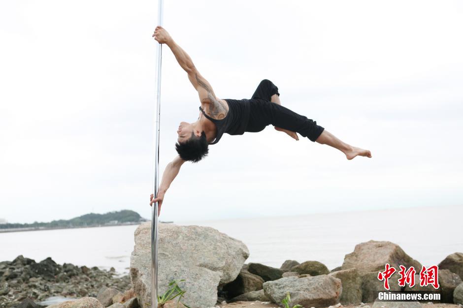 Wu Xin, who represented China to attend the pole dancing world championship early this year, is an outstanding male pole dancer. Male pole dancers are scarce in China since they are still misunderstood by some people. However, Wu Xin, as the chief couch of a famous pole dancing school, has decided to train more male pole dancers for athletic pole dancing. (Chinanews/Wang Xi) |