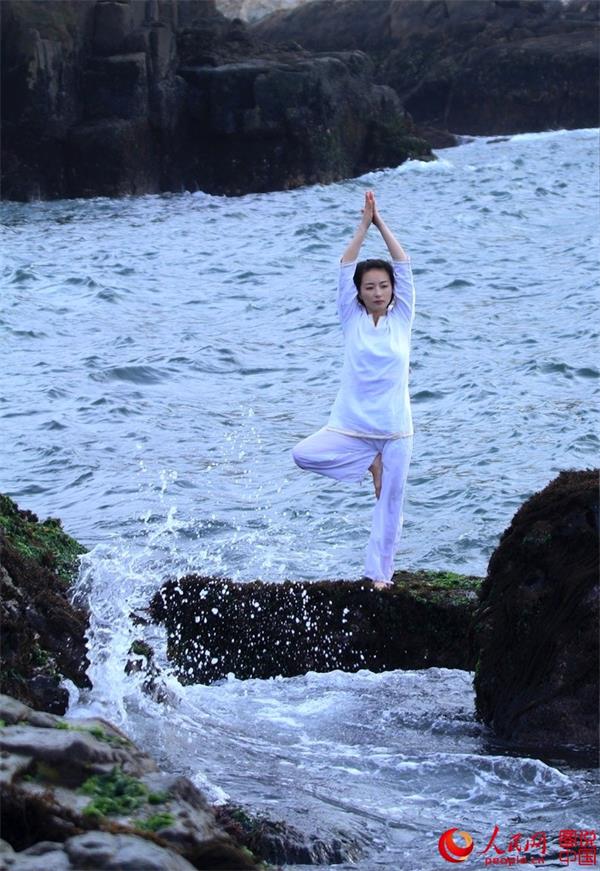 The photo shows a woman practicing yoga on the Yushan Island, near Ningbo, east China's Zhejiang province. Yushan Isand has abundant fish, shellfish and algae resources.(Photo/people.cn)