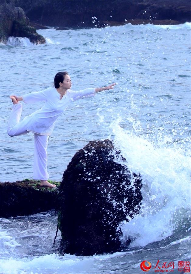 The photo shows a woman practicing yoga on the Yushan Island, near Ningbo, east China's Zhejiang province. Yushan Isand has abundant fish, shellfish and algae resources.(Photo/people.cn)