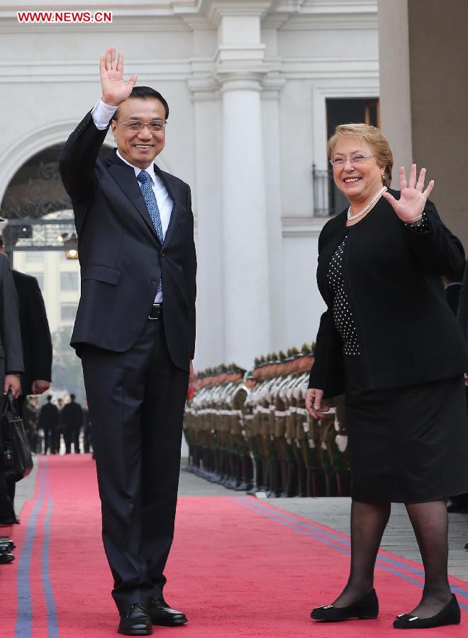 Chinese Premier Li Keqiang (L) and Chilean President Michelle Bachelet wave to journalists during their talks in Santiago, Chile, May 25, 2015. (Xinhua/Liu Weibing)