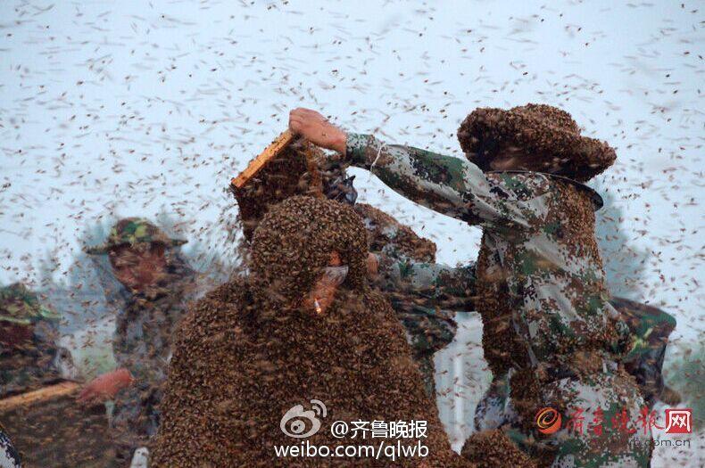 Gao Bingguo, a man from east China’s Shandong province, successfully sets a new Guinness record by covering his body in bees on May 25, 2015. Over a million bees covered his body like a bee garment. Gao got stung all over the body. (Photo source: Weibo of Qilu Evening News) |