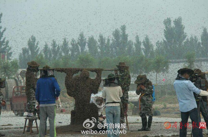 Gao Bingguo, a man from east China’s Shandong province, successfully sets a new Guinness record by covering his body in bees on May 25, 2015. Over a million bees covered his body like a bee garment. Gao got stung all over the body. (Photo source: Weibo of Qilu Evening News)