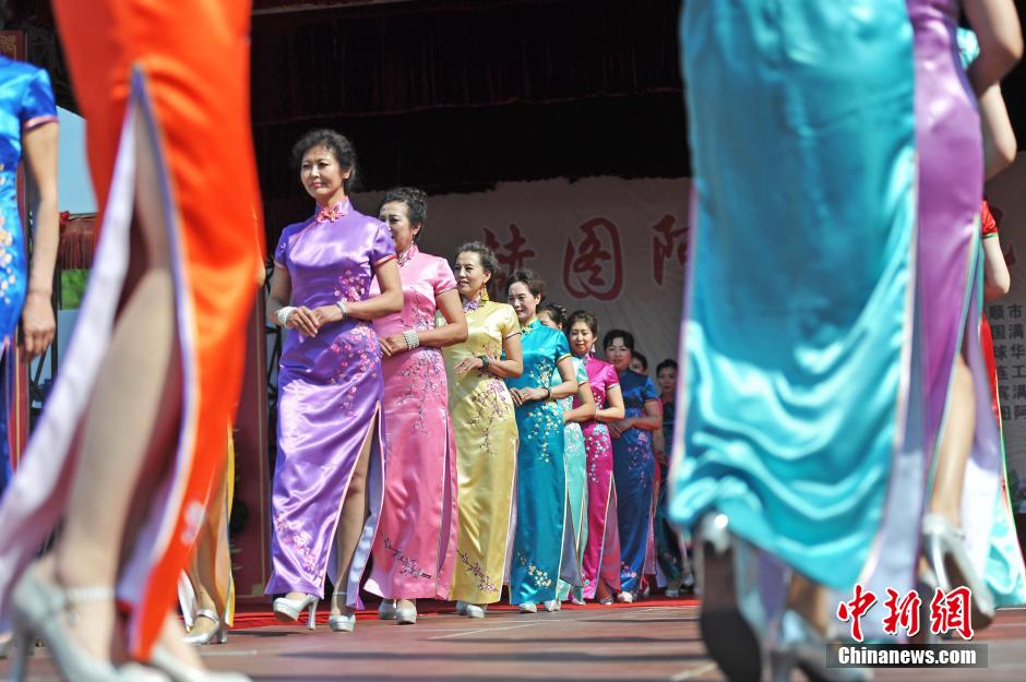 A group of ‘damas’ stage a cheongsam show in Xinbin Man Autonomous County, northeast China's Liaoning Province on May 25, 2015. Nearly 200 people showed cheongsams of different times at the first Hetu Ala Cheongsam Cultural Festival. It is said that Xinbin is the birthplace of the Qing Dynasty. Cheongsam has a deep historical root in this place. (CNS/Sun Haosheng) |