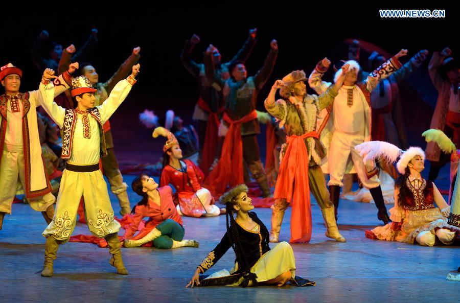 Dancers from the Song and Dance Troupe of the Xinjiang Production and Construction Corps perform in a dance drama in Beijing, capital of China, May 27, 2015. Invited by the organizer of the 15th "Meet in Beijing" Arts Festival, the dance drama premiered here on Wednesday. (Xinhua/Jin Liangkuai)