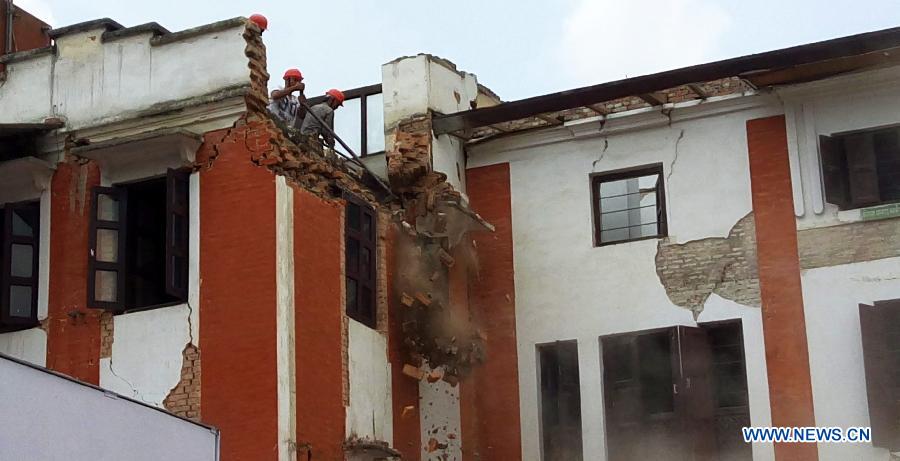Workers demolish a damaged school building in Kathmandu, capital of Nepal, on May 28, 2015. Schools are yet not ready to resume classes with proper preparations though the government declared to open schools in earthquake affected districts from May 31. (Xinhua/Sunil Sharma) |