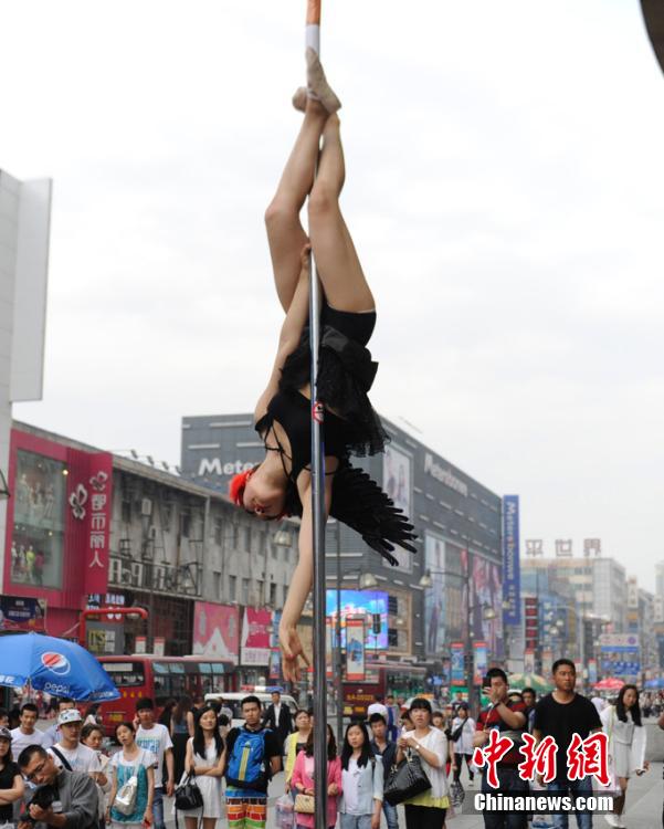 A girl performs pole dance in downtown Changchun, capital of northeast China's Jilin province, May 26, 2015. (CNS/Zhang Yao)