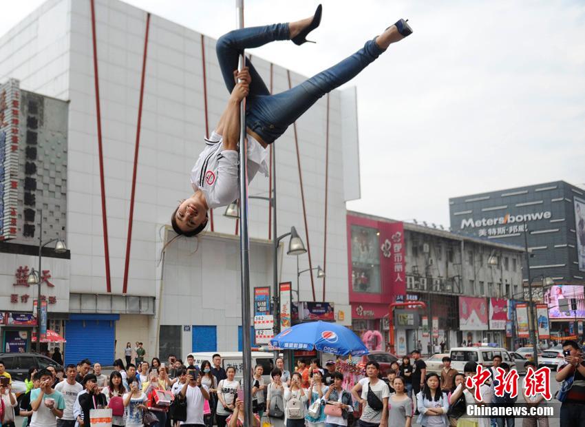 A girl performs pole dance in downtown Changchun, capital of northeast China's Jilin province, May 26, 2015. (CNS/Zhang Yao)