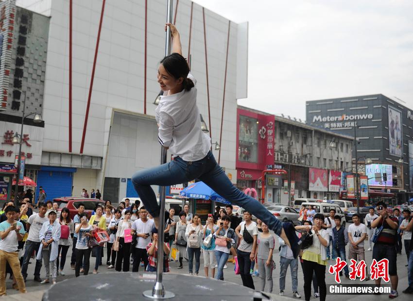 A girl performs pole dance in downtown Changchun, capital of northeast China's Jilin province, May 26, 2015. (CNS/Zhang Yao)