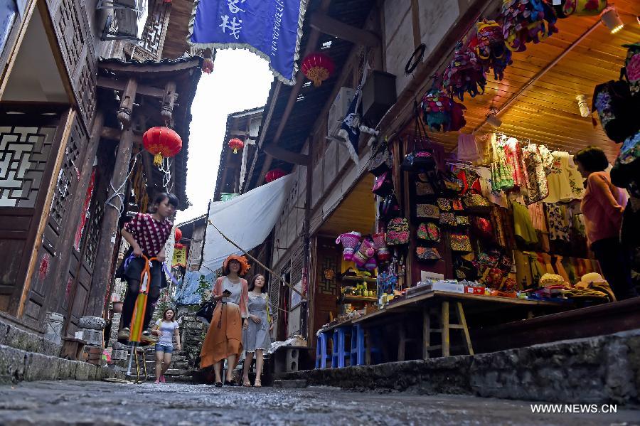 Photo taken on May 27, 2015 shows a street in Gongtan ancient town, southwest China's Chongqing. Located in the intersection of Wujiang River and Apeng River, Gongtan enjoys a history of over 1,700 years. Gongtan ancient town has now been developed into a tourist site after it was relocated a kilometer away from the original site in 2008 due to the construction of a hydropower station. (Xinhua/Chen Cheng) |
