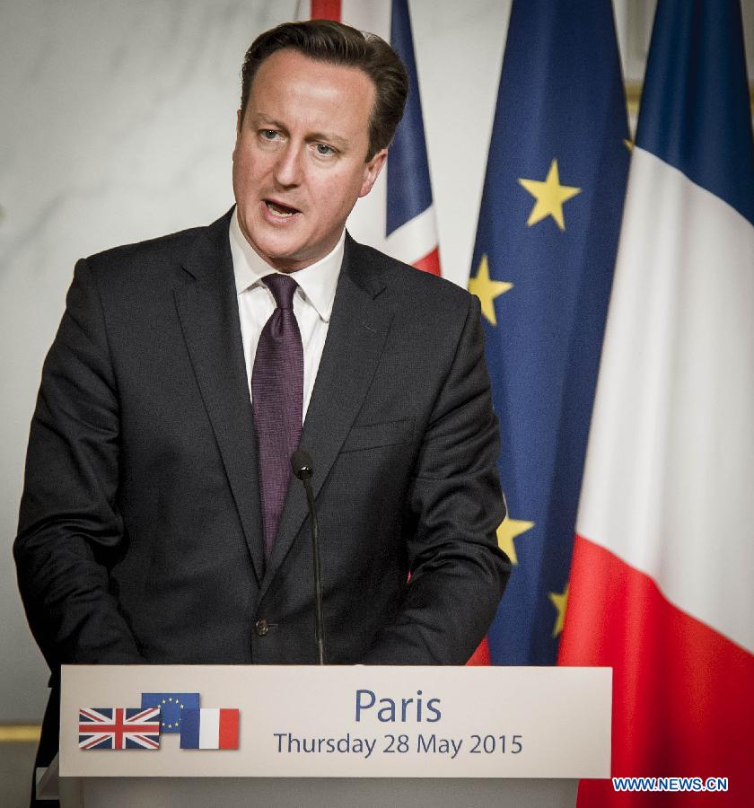 British Prime Minister David Cameron attends a press conference in Paris, France, on May 28, 2015. French President Francois Hollande on Thursday received British Prime Minister David Cameron who started a European tour to build support for EU reforms before EU membership in-out referendum by the end of 2017. (Xinhua/Chen Xiaowei) |