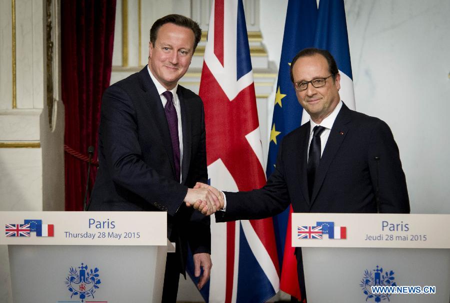 French President Francois Hollande (R) and British Prime Minister David Cameron attend a press conference in Paris, France, on May 28, 2015. French President Francois Hollande on Thursday received British Prime Minister David Cameron who started a European tour to build support for EU reforms before EU membership in-out referendum by the end of 2017. (Xinhua/Chen Xiaowei) |