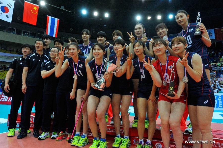 Team South Korea pose for a photo after the awarding ceremony at the 18th Asian Senior Women's Volleyball Championships in Tianjin, north China, May 28, 2015. South Korea lost to China 0-3 in the final. (Xinhua/Zhang Chenlin)