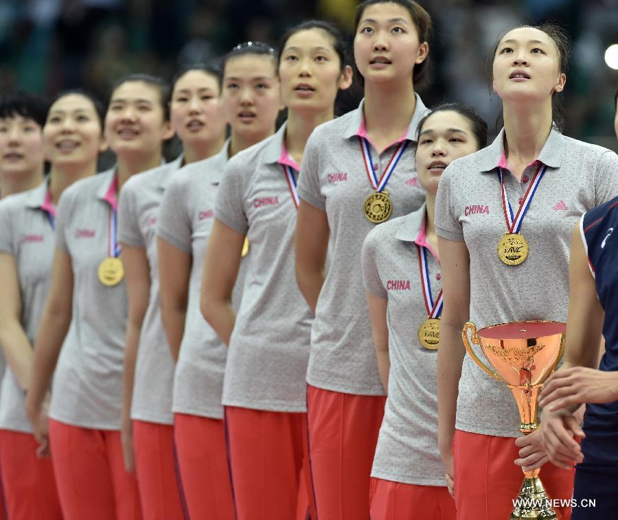 Team China listen to Chinese national anthem during the award ceremony after the final match against South Korea at the 18th Asian Senior Women's Volleyball Championships in Tianjin, north China, May 28, 2015. China won 3-0 to claim the title. (Xinhua/Yue Yuewei) |