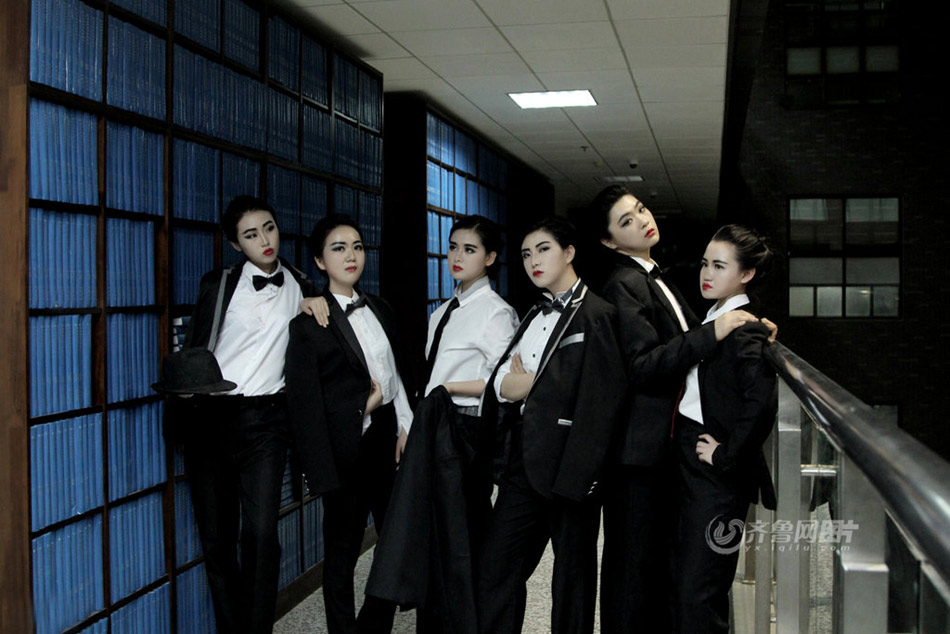 Girls of Law School of Shandong University in east China’s Shandong province take a group of unisex style graduation photos themed with “legal beauties”. (Photo source: iqilu.com)