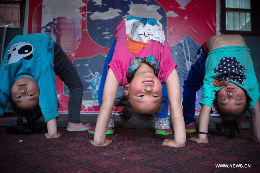 Photo taken on May 26, 2015 shows Children doing acrobatics exercises in an acrobatics school in Sanwang Village, Yingshang County of east China's Anhui Province. Founded in 2007, the acrobatics school in Sanwang Village enrolls more than a hundred children every year, who learn acrobatics for making a living. (Xinhua/Guo Chen) |