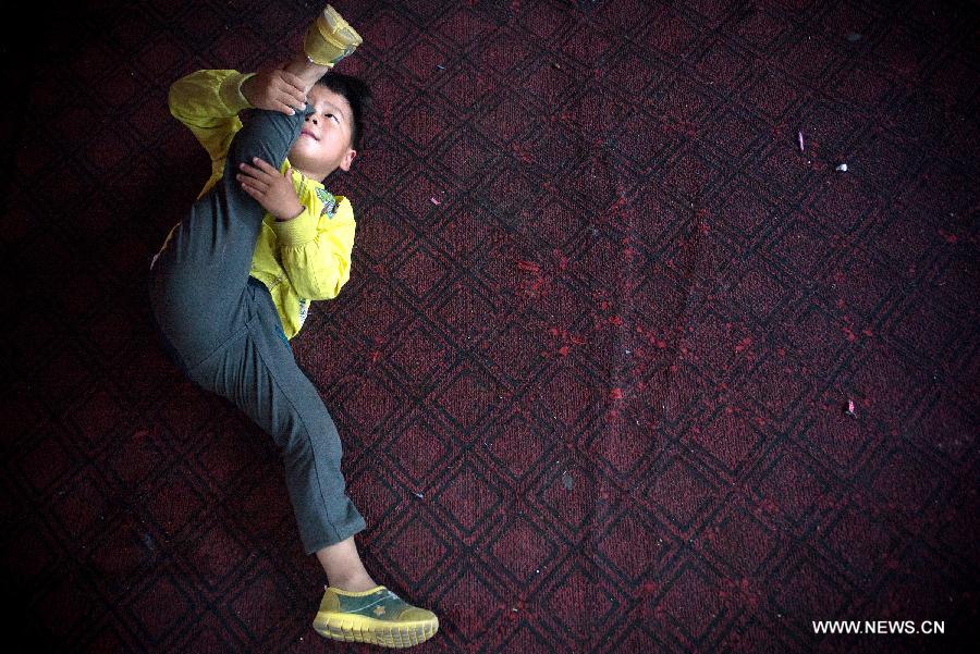 Photo taken on May 26, 2015 shows five-year-old Luan Haohao doing acrobatics exercises in an acrobatics school in Sanwang Village, Yingshang County of east China's Anhui Province. Founded in 2007, the acrobatics school in Sanwang Village enrolls more than a hundred children every year, who learn acrobatics for making a living. (Xinhua/Guo Chen) |