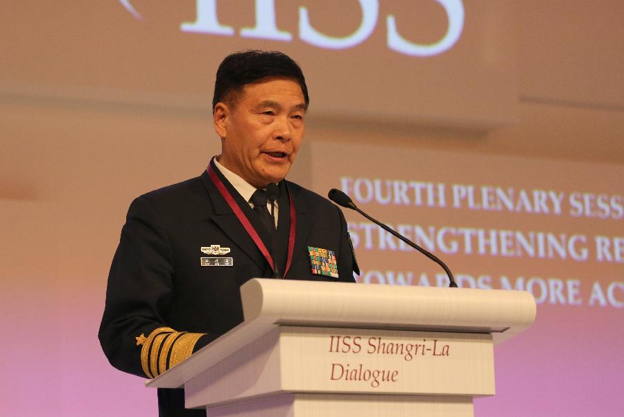 Admiral Sun Jianguo, deputy chief of staff of China's People's Liberation Army (PLA) addresses the fourth plenary session of the Shangri-La Dialogue in Singapore, May 31, 2015. Sun Jianguo elaborated on China's foreign and defense policies. (Xinhua/Bao Xuelin) |