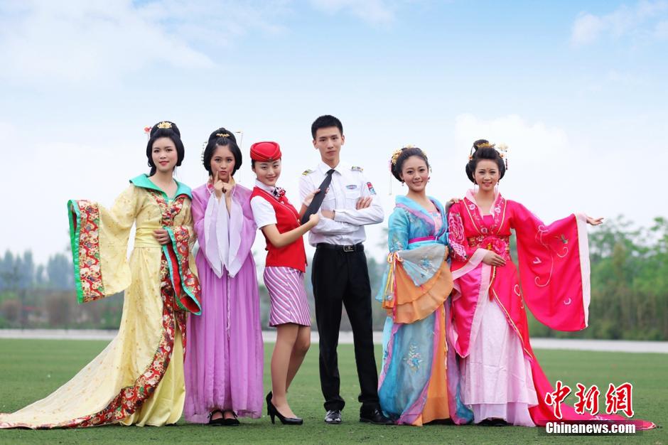 Upon graduation, eight students from Chengdu East Star Airlines Travel College take creative photos to celebrate their colorful university life. These students have been recruited as flight attendants.(Photo/Chinanews.com)