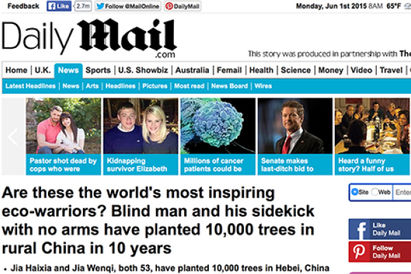 On March 16, the Daily Mail republished a news story, Blind man and his sidekick with no arms have planted 10,000 trees in rural China in 10 years, which was originally published on People’s Daily Online on March 12. The touching story resonates with a large number of netizens.