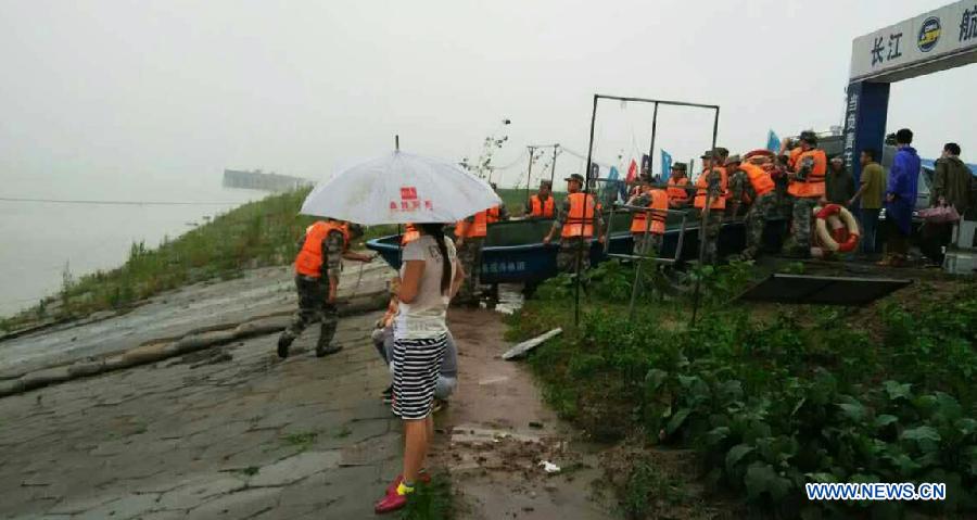 Rescuers work near the ship sinking site in the Jianli section of the Yangtze River in central China's Hubei Province June 2, 2015. A passenger ship carrying 458 people sunk Monday night in the Yangtze River, China's longest. Rescue work is hampered by strong wind and heavy rain. (Xinhua)