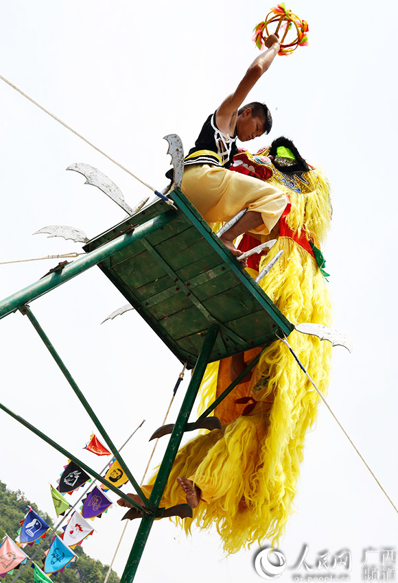 The lion dance of Zhuang people in Tianyang county, south China’s Guangxi is famous for its high difficulty. The stunts often performed in Tianyang lion dance include knifepoint dance, quincuncial piles dance and bridge dance. Tianyang lion dance was identified as a national level intangible cultural heritage in 2009. (Photo source: people.cn)