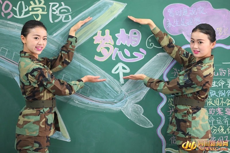 Twins who will become flight attendants pose for a photo in Sichuan Southwest Vocational College of Civil Aviation. (Photo/newssc.org)