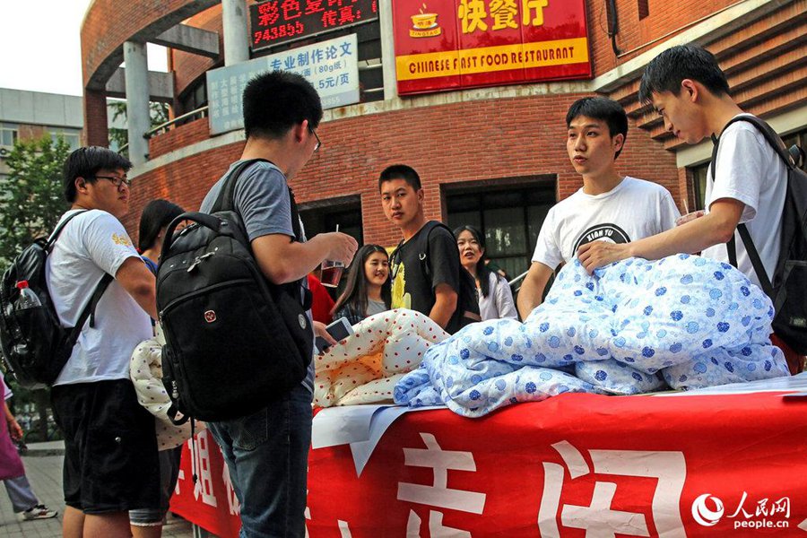 Long Yi sets up a booth beside the dormitory building to sell quilts on May 31, 2015. (Photo/People's Daily Online)