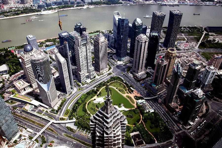 Photo taken from Shanghai Tower on Aug. 3, 2013 shows a view of downtown Shanghai, east China. Shanghai Tower, a megamall skyscraper under construction, stands approximately 632 meters high and has 128 stories, with a total floor area of 380,000 square meters. It's projected to open to the public in mid-2015. (Xinhua/Huang Weiguo)