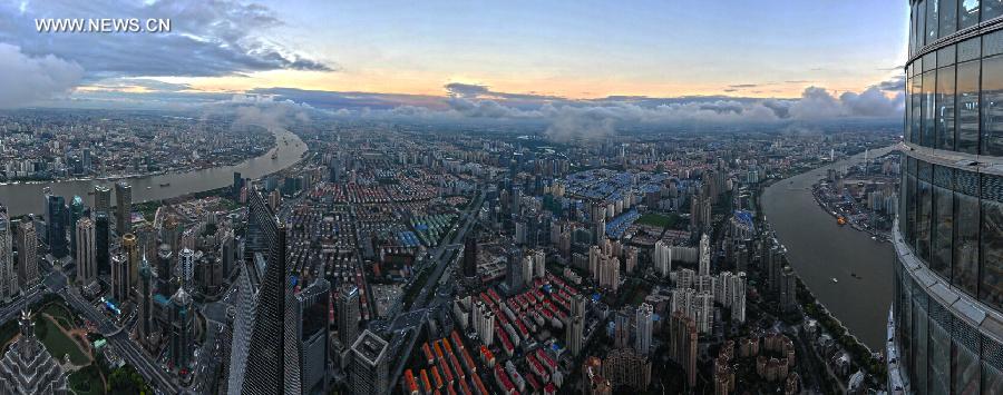 Photo taken from Shanghai Tower on Sept. 20, 2014 shows a view of downtown Shanghai, east China. Shanghai Tower, a megamall skyscraper under construction, stands approximately 632 meters high and has 128 stories, with a total floor area of 380,000 square meters. It's projected to open to the public in mid-2015. (Xinhua/Huang Weiguo) |