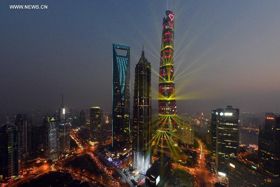 Photo taken from Shanghai Tower on Dec. 28, 2014 shows a view of downtown Shanghai, east China. Shanghai Tower, a megamall skyscraper under construction, stands approximately 632 meters high and has 128 stories, with a total floor area of 380,000 square meters. It's projected to open to the public in mid-2015. (Xinhua/Huang Weiguo) |
