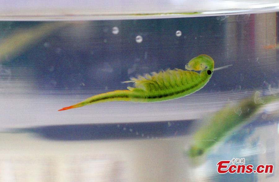 A tadpole shrimp swims in a vessel at the Insect Museum of West China in Chengdu city, capital of Southwest China's Sichuan province. Tadpole shrimps and fairy shrimps, which both have outlived dinosaurs, were found in a field by researchers of the museum.