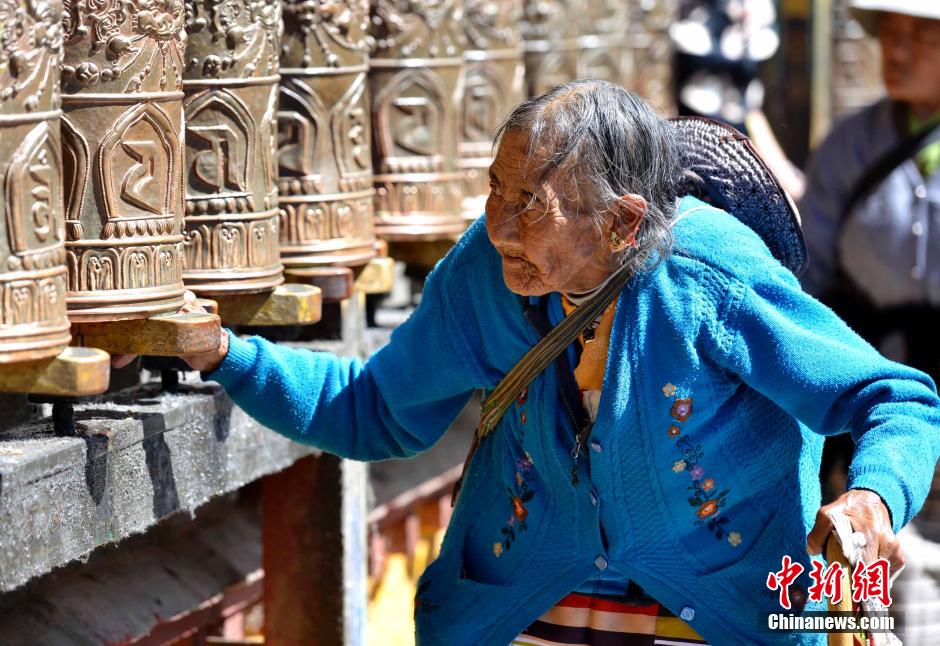 Large number of Buddhists come to Tibet during Tibetan traditional Festival “Saga Dawa” in April of the Tibetan calendar. Most of them walked along three roads in Lhasa while turning the prayer wheels. The festival commemorates the birth, enlightenment, and death of Gautama Buddha. (Chinanews.com/Li Lin)