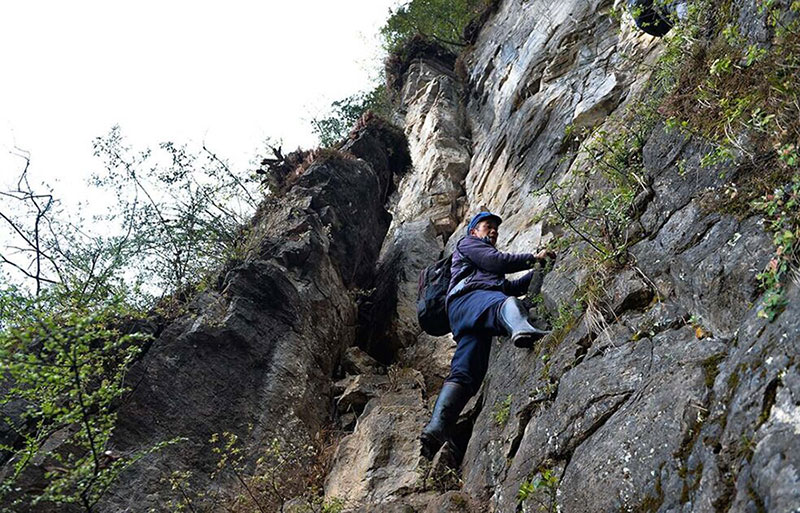 A villager climbs on the cliff. (Western China Metropolis Daily/Yang Tao)