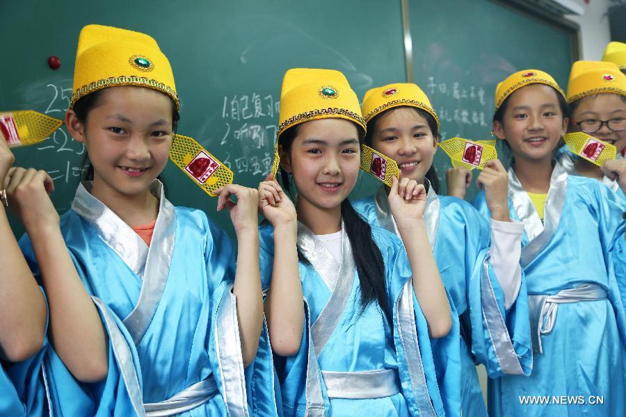 Graduates of Zhuangyuan Elementary School pose for a graduation photo in Chongqing, southwest China, June 2, 2015. As the graduation season comes, graduates are busy with taking creative graduation photos at campuses. (Xinhua/Qin Tingfu)