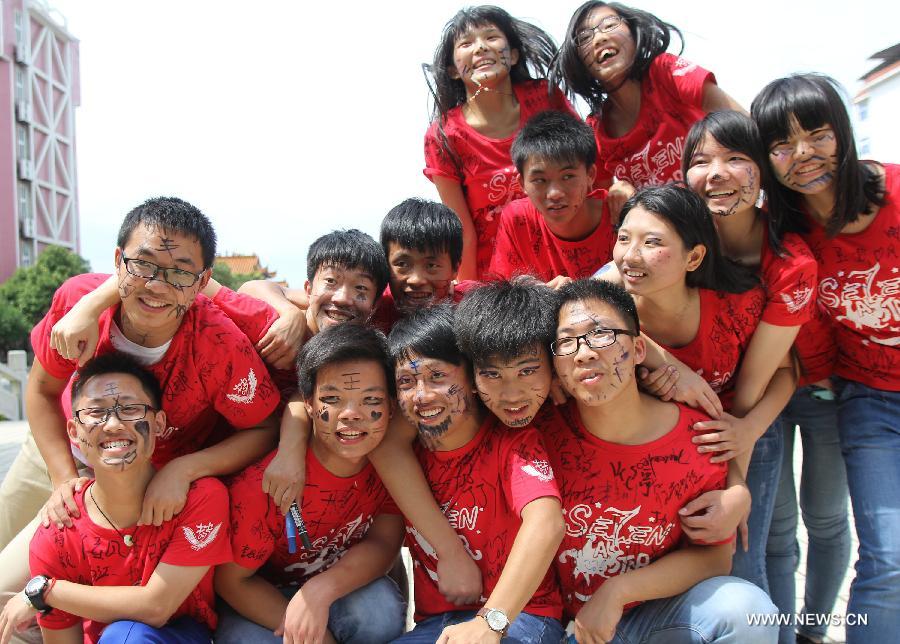 Graduates of the No. 1 Middle School of Daoxian County pose for a graduation photo in Yongzhou, central China's Hunan Province, June 2, 2015. As the graduation season comes, graduates are busy with taking creative graduation photos at campuses. (Xinhua/He Hongfu) |