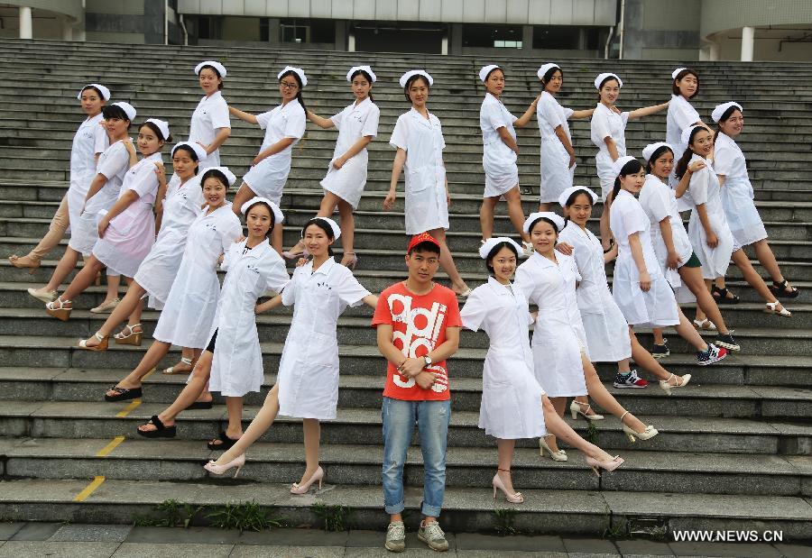 Graduates of the School of Nursing at University of South China pose for a graduation photo in Hengyang, central China's Hunan Province, May 19, 2015. As the graduation season comes, graduates are busy with taking creative graduation photos at campuses. (Xinhua/Cao Zhengping)