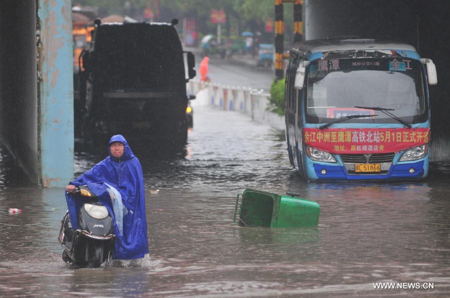 Vehicles move on a flooded street in Yingtan City, east China's Jiangxi Province, June 3, 2015. Torrential downpours swept through provinces Jiangxi and Guizhou on Wednesday. (Xinhua/Hu Nan)
