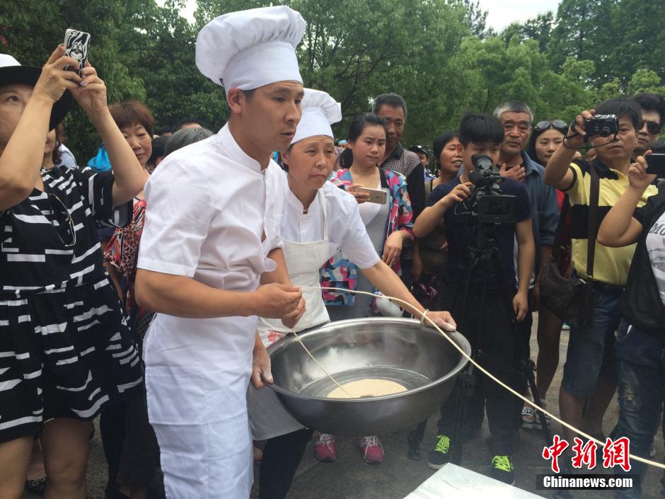 450 tourists, side by side, hold a 300-meter-long noodle in Pujiang county, east China’s Zhejiang province on June 2, 2015. Also called “longevity noodle”, the long noodle is a local specialty. (Chinanews/Xi Jinyan)